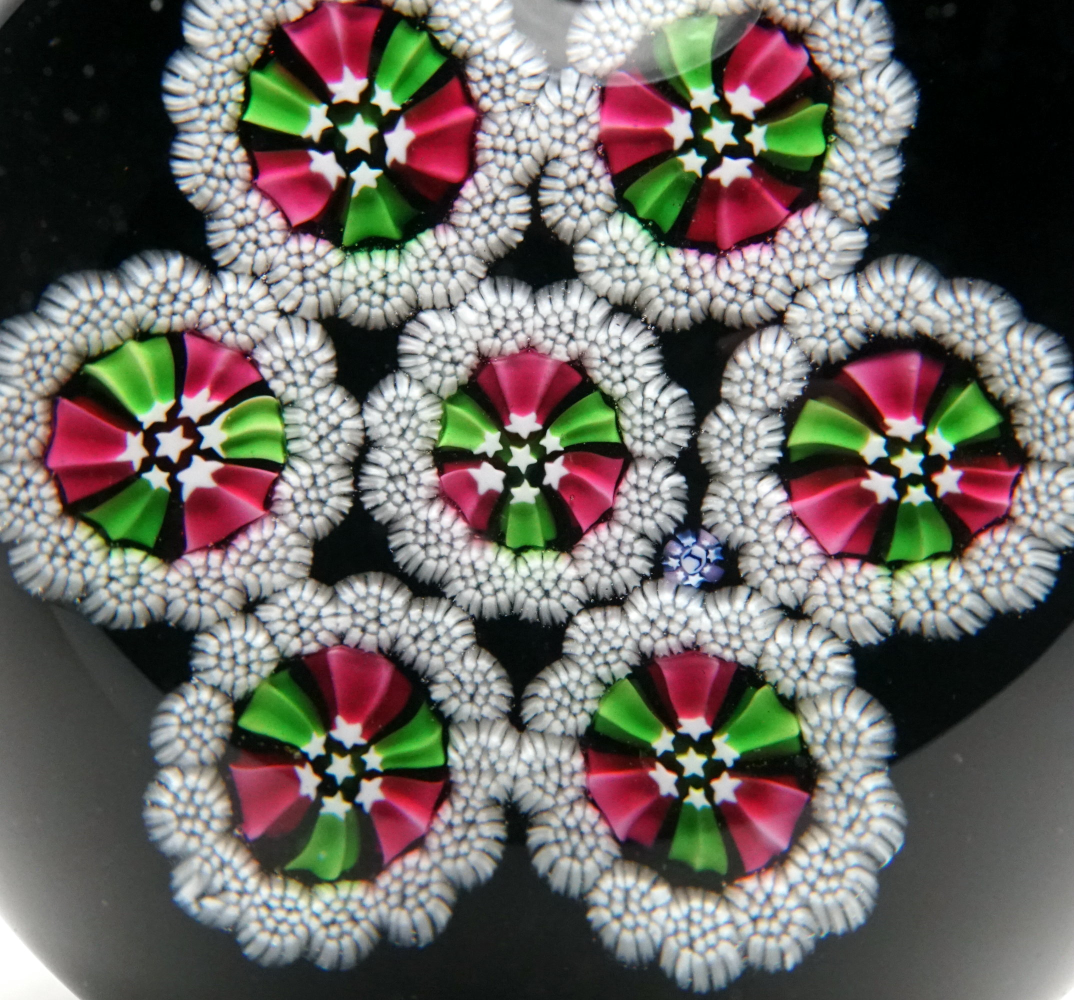 white latticinio twist cane. There is a central ring of six