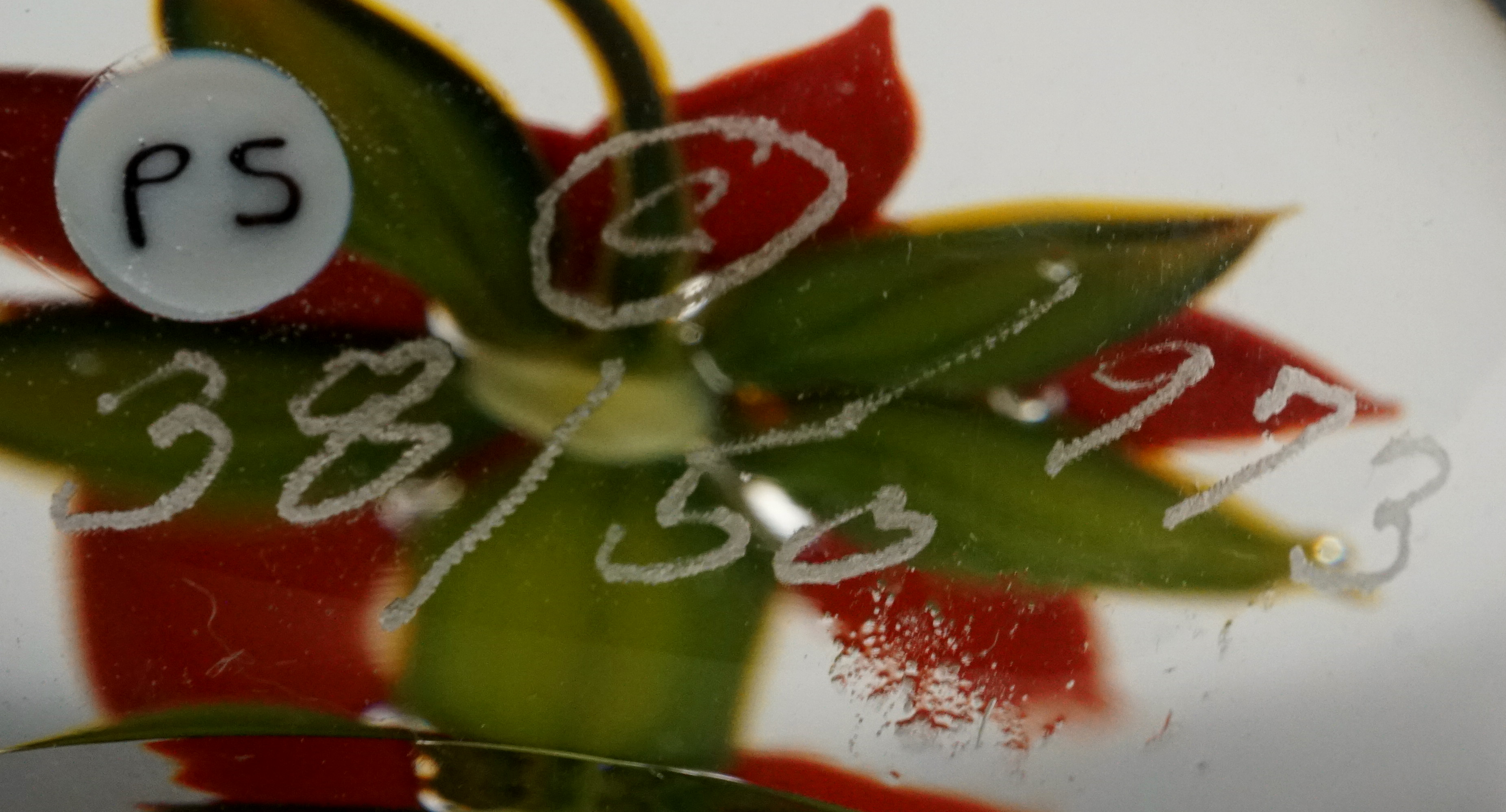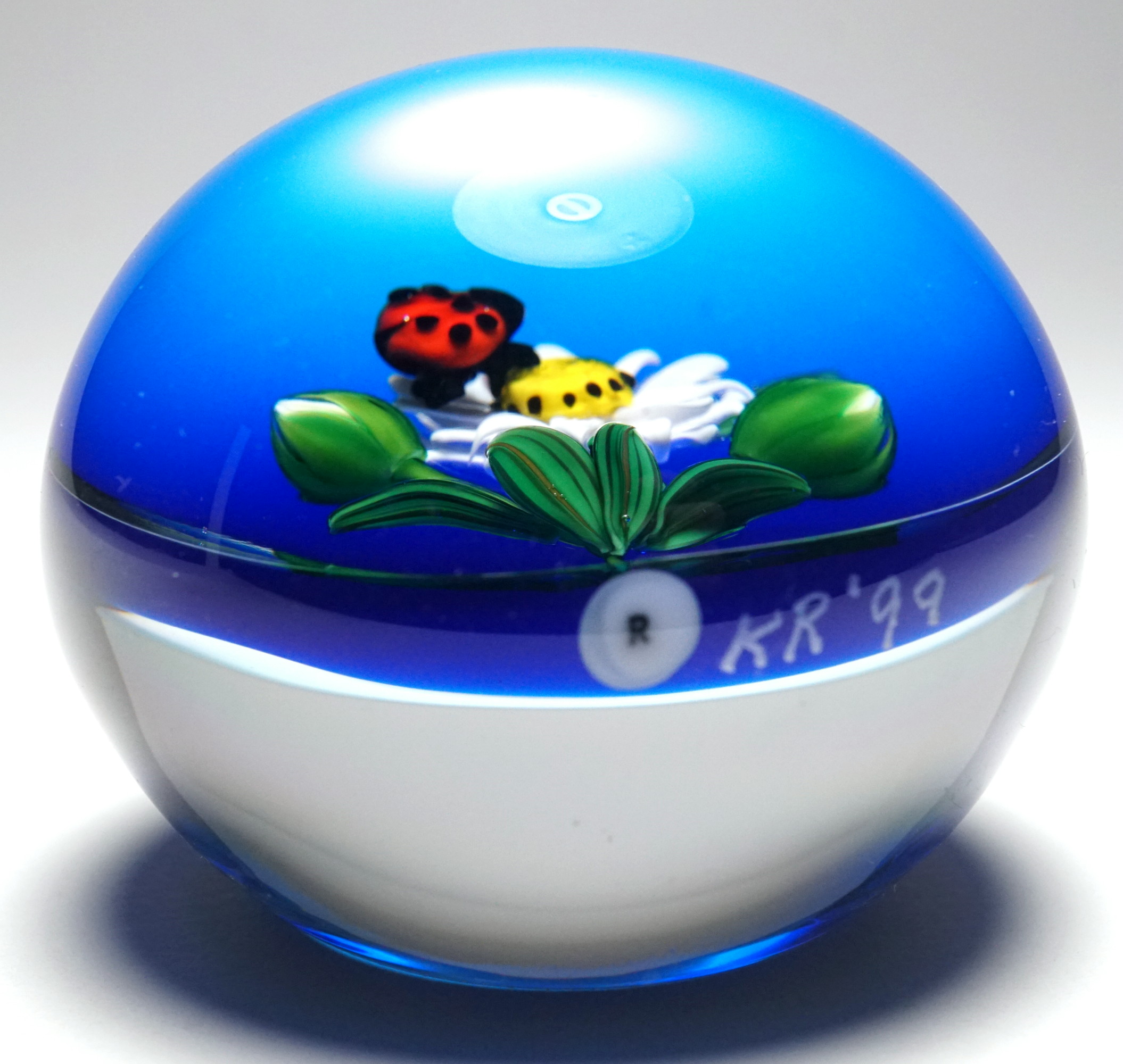 on White Daisy Paperweight. dated 1999. This