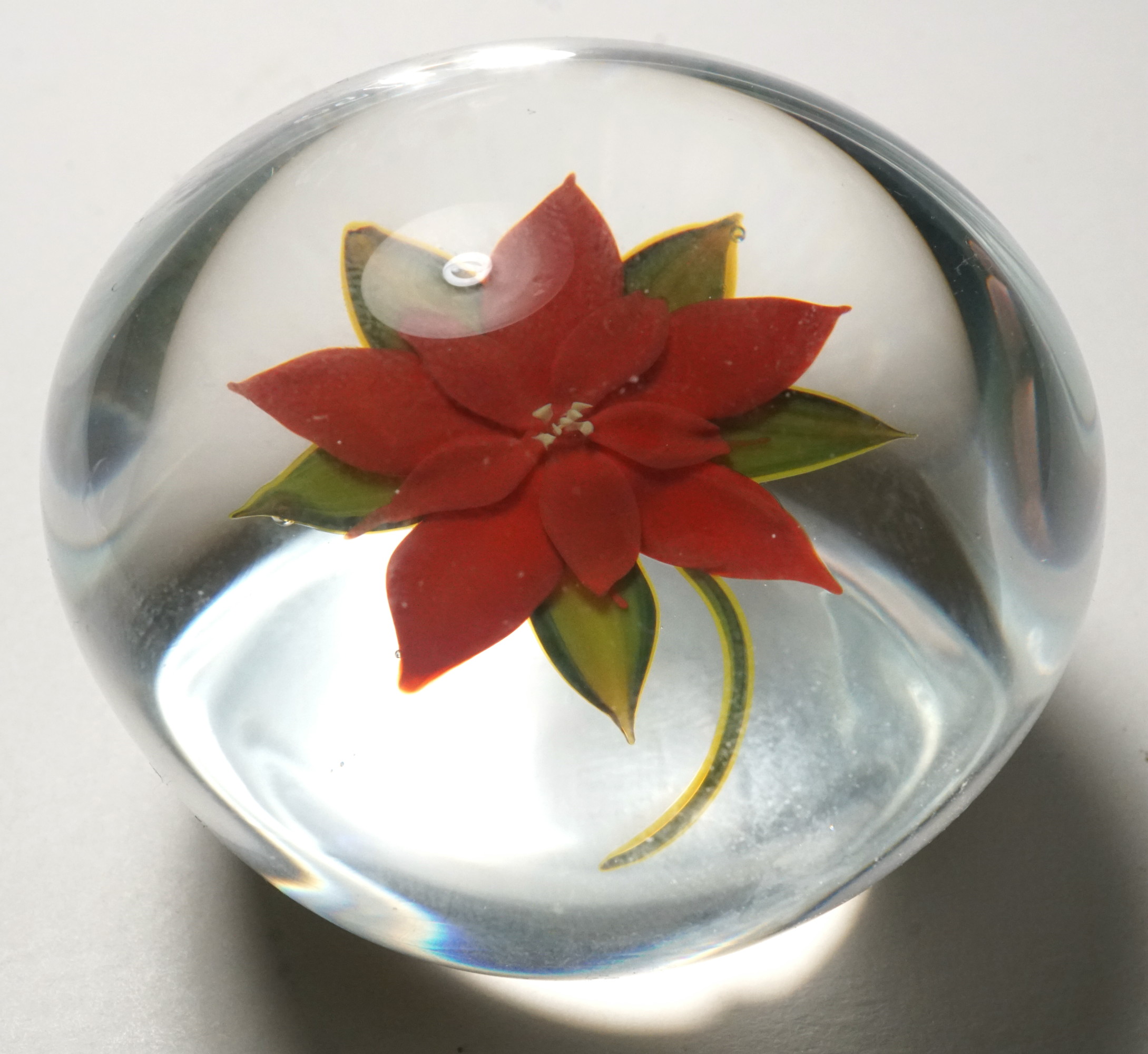 This paperweight features a delicate red double poinsettia on a